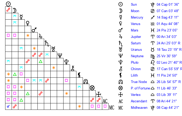 | Saturn | 24 Aries 34 | 25 Pisces 47 | 0 Taurus 18 |
