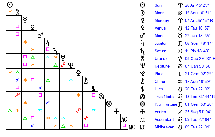 | Sun | 26 Aries 46 | 27 Aries 56 | 20 Leo 58 |