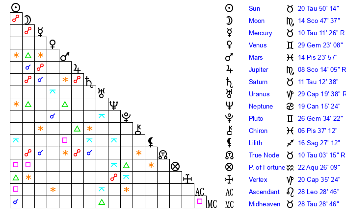 | Saturn | 11 Taurus 45 | 28 Pisces 52 | 20 Taurus 50 |