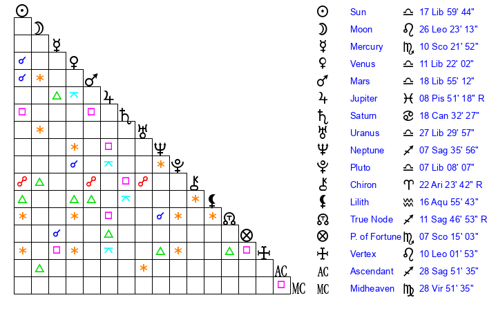 | Venus | 11 Libra 22 | 27 Virgo 18 | 15 Sagittarius 20 |