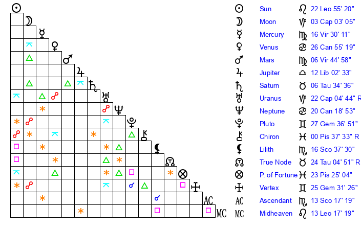 | Sun | 22 Leo 55 | 24 Leo 5 | 16 Sagittarius 46 |