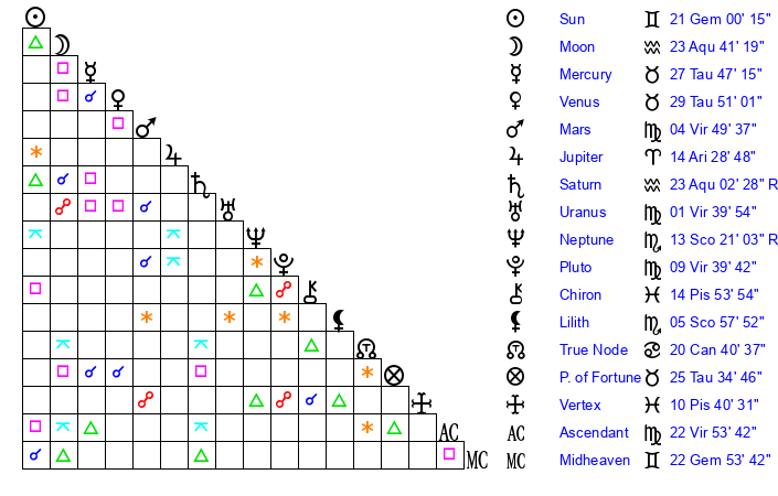 | Sun | 21 Gemini 0 | 21 Gemini 58 | 20 Leo 13 |