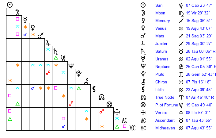 Sun | 7 Capricorn 24 | 8 Capricorn 13 | 29 Aries 45 |