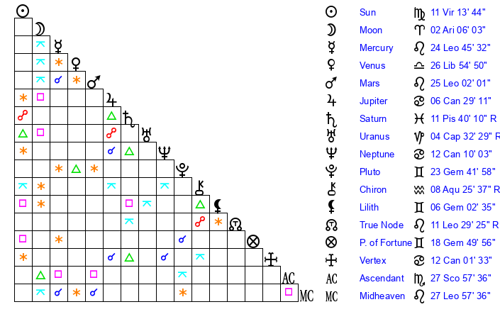 | Sun | 11 Virgo 14 | 12 Virgo 25 | 10 Capricorn 9 |