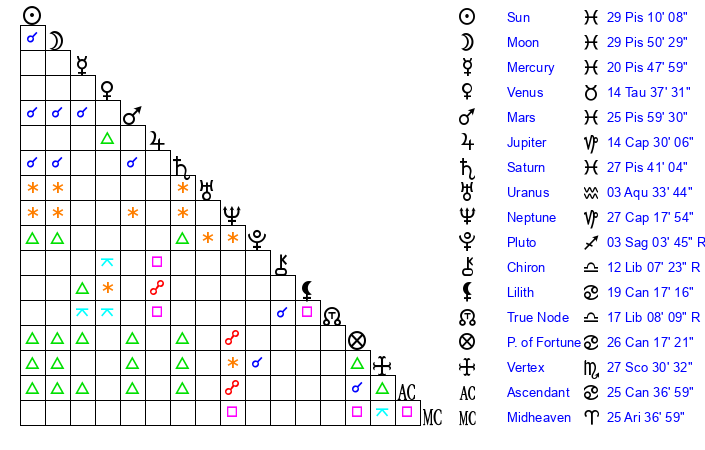 | Sun | 29 Pisces 10 | 29 Pisces 8 | 27 Aries 45 |