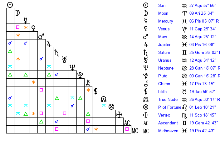 | Sun | 27 Aquarius 58 | 29 Aquarius 17 | 15 Gemini 50 |