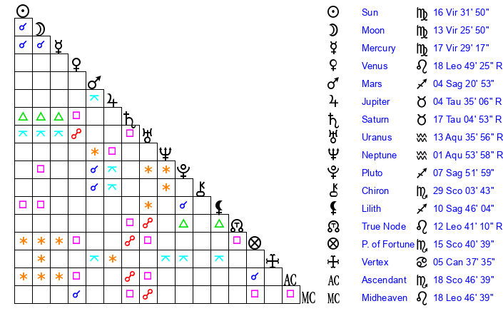 Moon | 13 Virgo 19 | 12 Aries 47 | 26 Leo 10 |