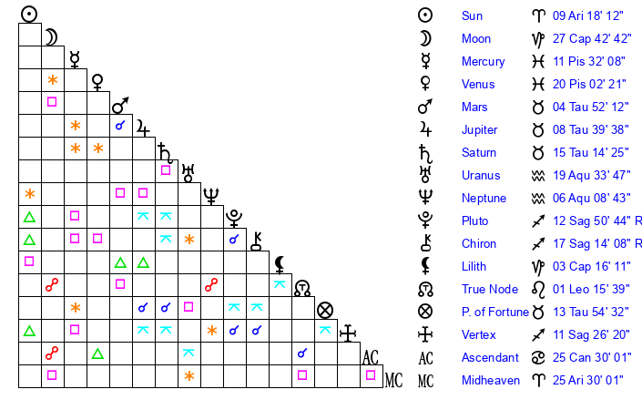 Moon | 27 Capricorn 33 | 12 Aries 48 | 0 Capricorn 0 |