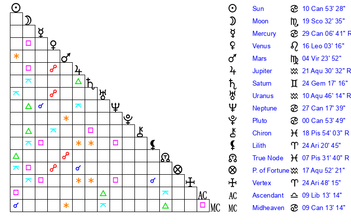 | Moon | 19 Scorpio 34 | 21 Libra 52 | 16 Sagittarius 44 |