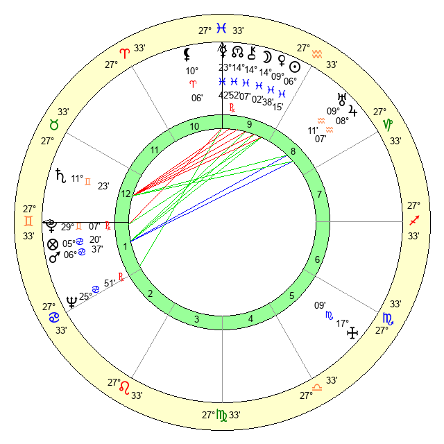 | Sun | 6 Pisces 16 | 7 Pisces 20 | 24 Gemini 40 |