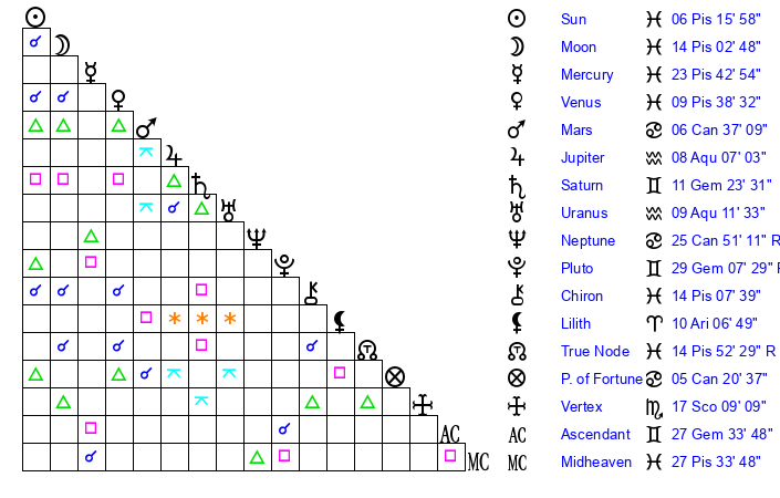 | Sun | 6 Pisces 16 | 7 Pisces 20 | 24 Gemini 40 |