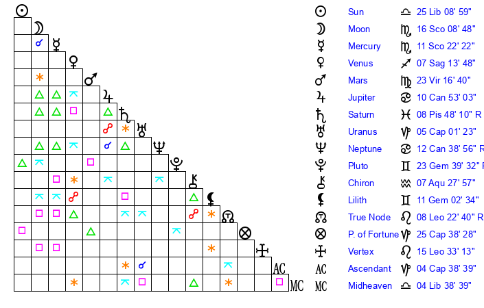 | Moon | 15 Scorpio 58 | 3 Libra 25 | 0 Aries 47 |