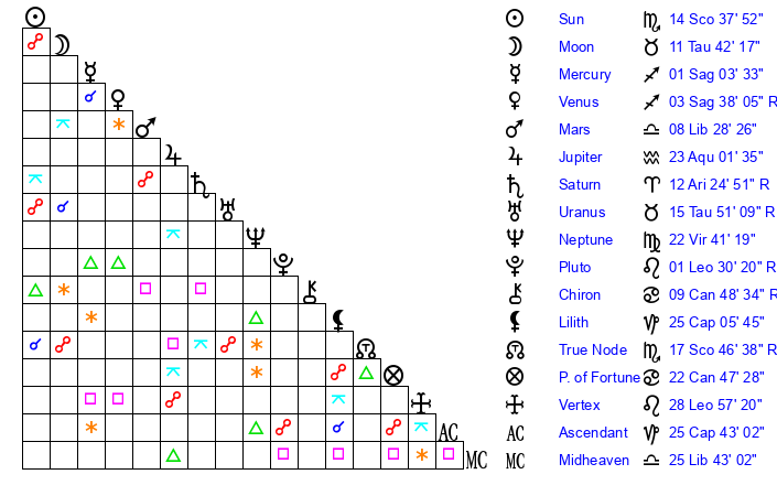 | Venus | 3 Sagittarius 37 | 0 Scorpio 57 | 26 Sagittarius 10 |