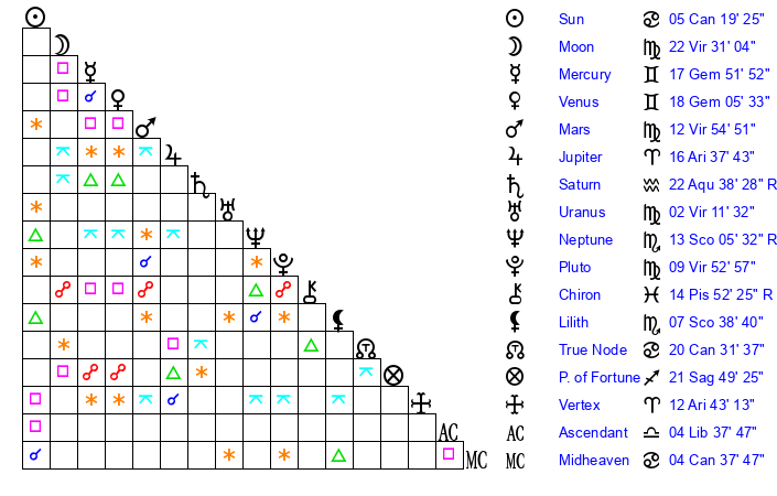 | Jupiter | 16 Aries 27 | 4 Cancer 4 | 18 Aries 40 |
