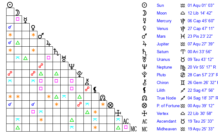 | Sun | 1 Aquarius 1 | 1 Aquarius 54 | 27 Aries 59 |