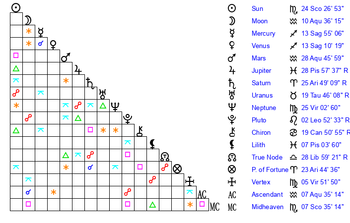 | Sun | 24 Scorpio 27 | 25 Scorpio 36 | 21 Aquarius 50 |