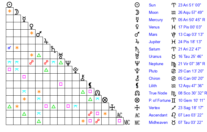 | Sun | 23 Aries 51 | 25 Aries 0 | 16 Cancer 34 |