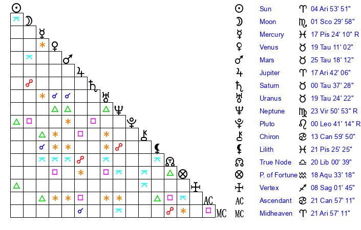 | Sun | 4 Aries 54 | 5 Aries 18 | 27 Gemini 16 |