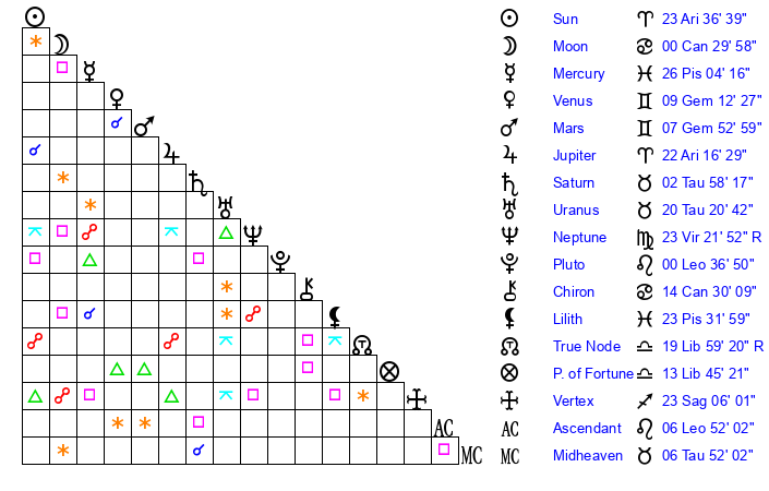 | Sun | 23 Aries 36 | 24 Aries 1 | 15 Cancer 23 |