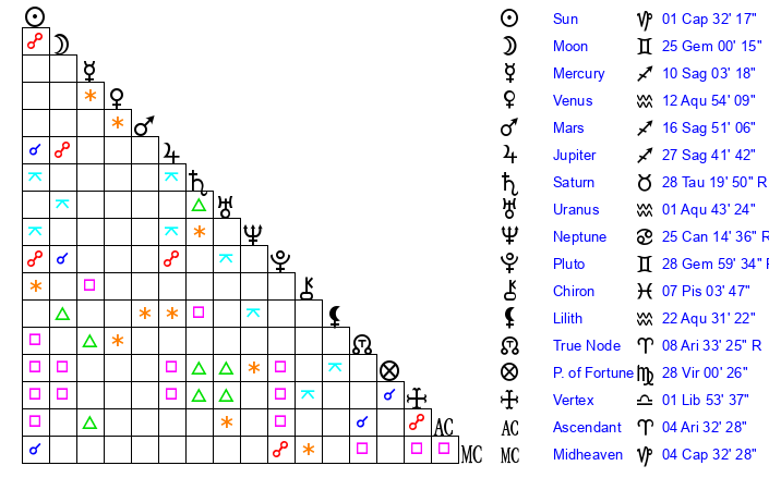 | Sun | 1 Capricorn 32 | 2 Capricorn 7 | 25 Aries 7 |
