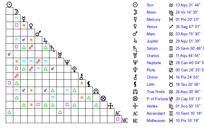 | Sun | 13 Aquarius 32 | 14 Aquarius 51 | 2 Gemini 10 |