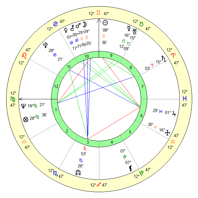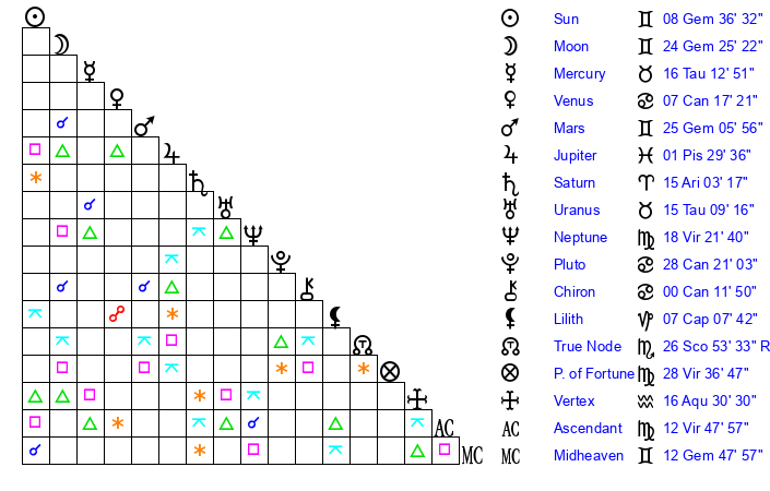 | Sun | 8 Gemini 36 | 9 Gemini 32 | 1 Virgo 49 |