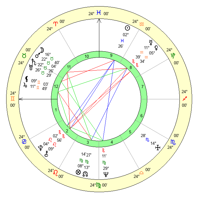 | Sun | 2 Pisces 27 | 3 Pisces 19 | 24 Taurus 13 |