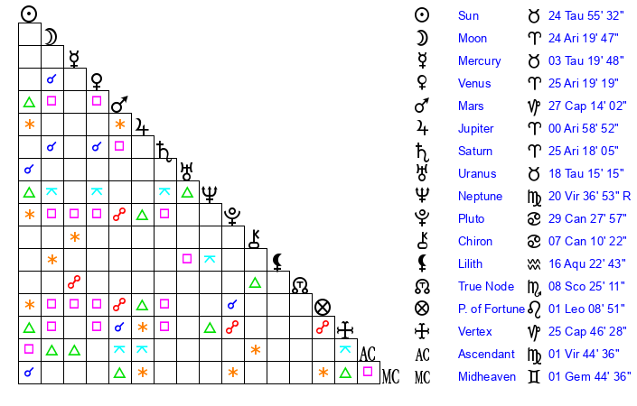 | Venus | 25 Aries 19 | 11 Aries 13 | 10 Leo 0 |