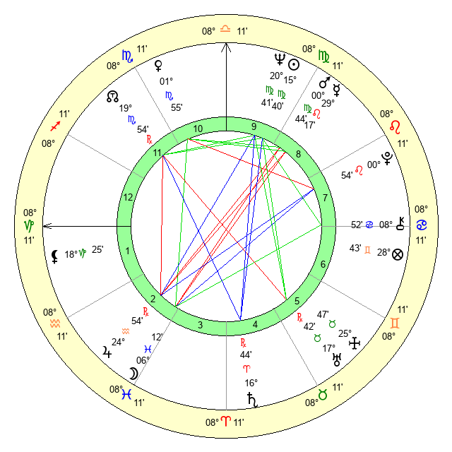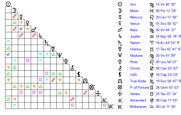 | Sun | 15 Virgo 40 | 16 Virgo 36 | 12 Sagittarius 13 |