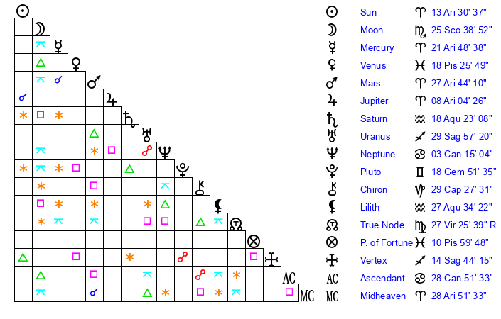 | Sun | 13 Aries 30 | 14 Aries 11 | 9 Leo 55 |