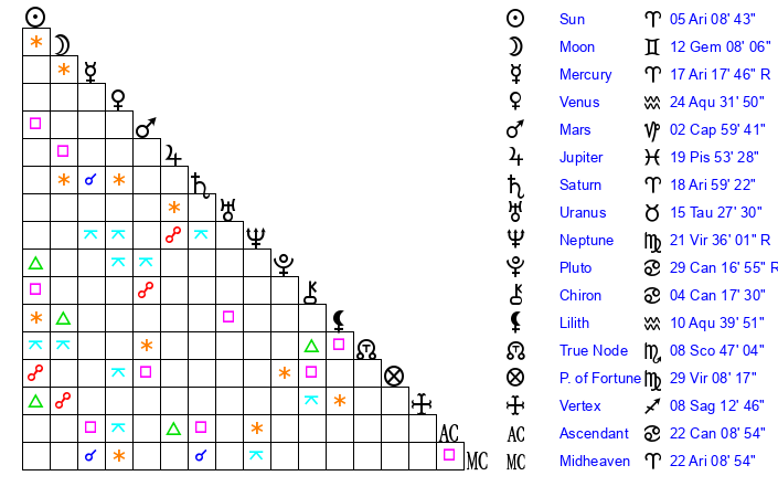 | Sun | 5 Aries 8 | 6 Aries 17 | 28 Gemini 27 |