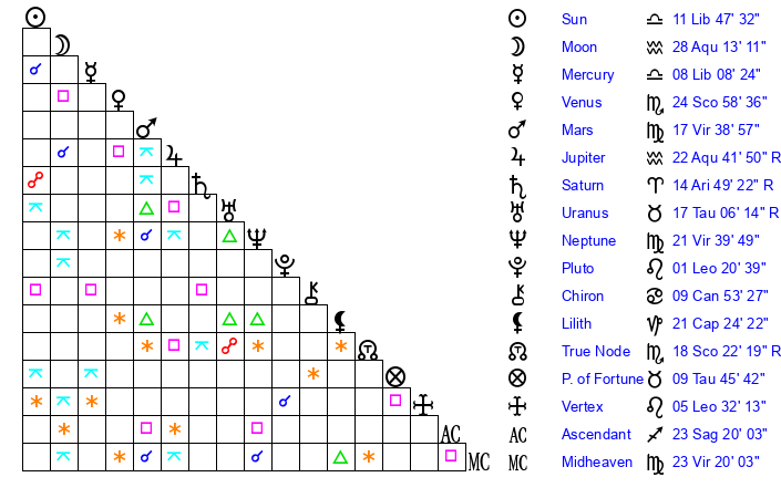 | Neptune | 21 Virgo 40 | 0 Aries 24 | 23 Virgo 19 |