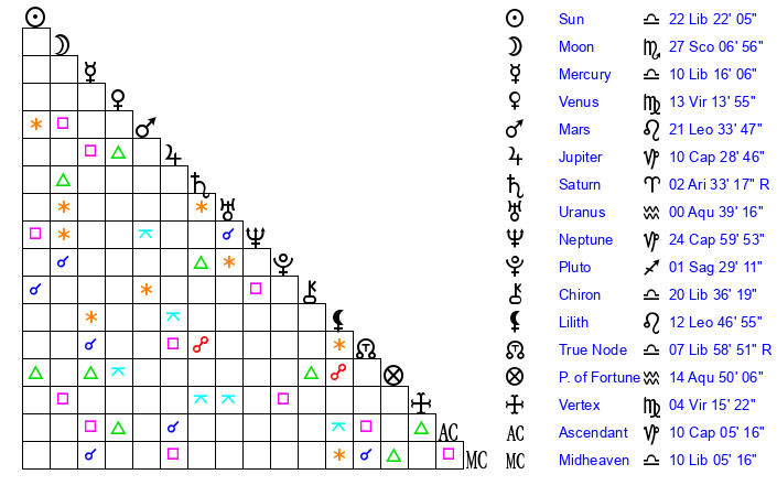Sun | 22 Libra 22 | 22 Libra 35 | 20 Scorpio 20 |