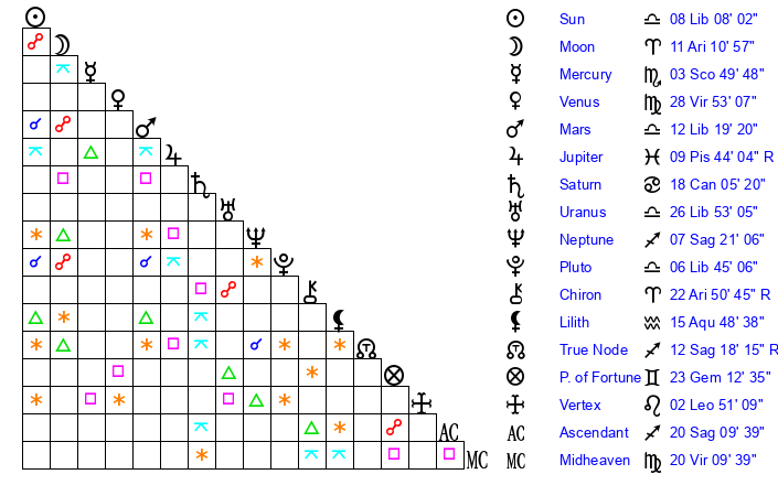 | Neptune | 7 Sagittarius 20 | 0 Aries 31 | 8 Sagittarius 56 |