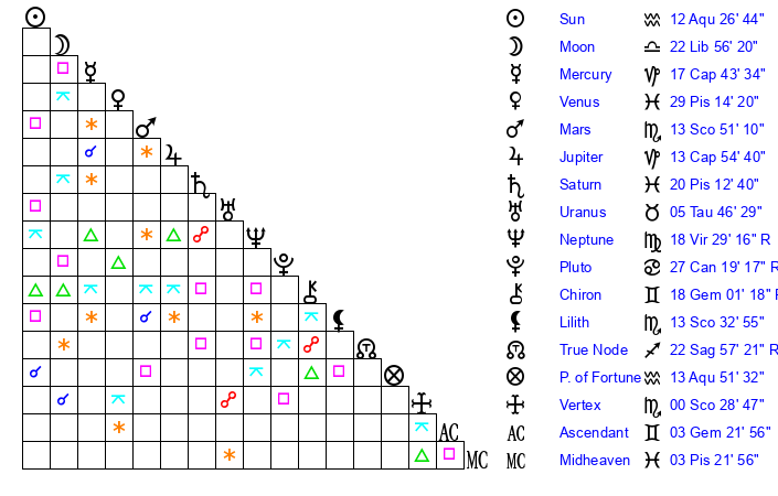 | Moon | 22 Libra 56 | 25 Pisces 0 | 4 Capricorn 53 |