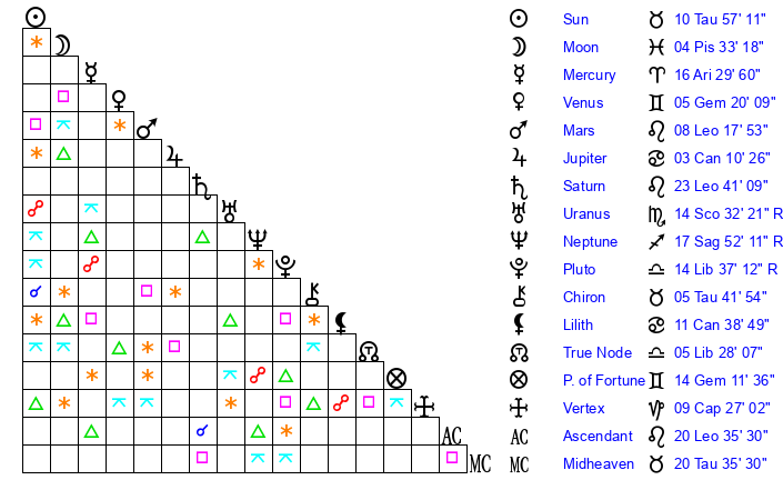 | Sun | 10 Taurus 58 | 11 Taurus 34 | 26 Gemini 8 |