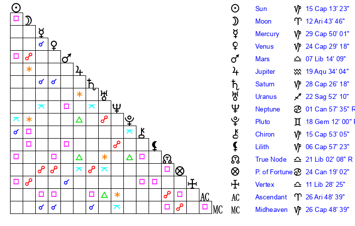| Pluto | 18 Gemini 12 | 2 Aquarius 53 | 18 Gemini 27 |
