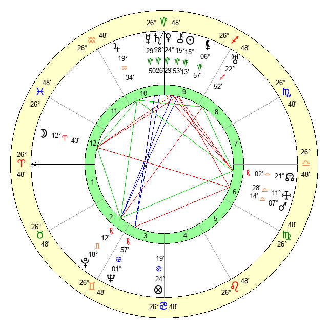 | Moon | 12 Aries 48 | 29 Leo 56 | 25 Libra 52 |