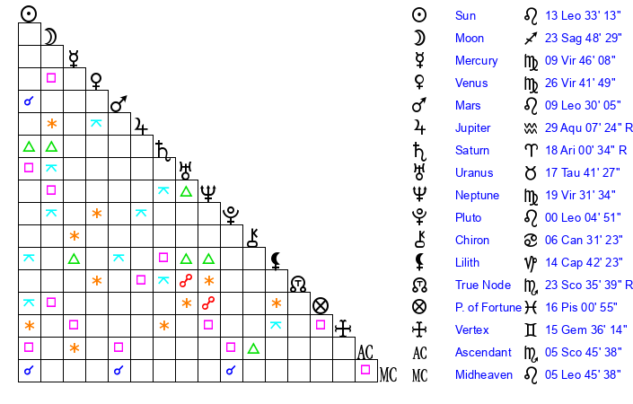 | Pluto | 0 Leo 5 | 2 Aquarius 17 | 1 Leo 30 |