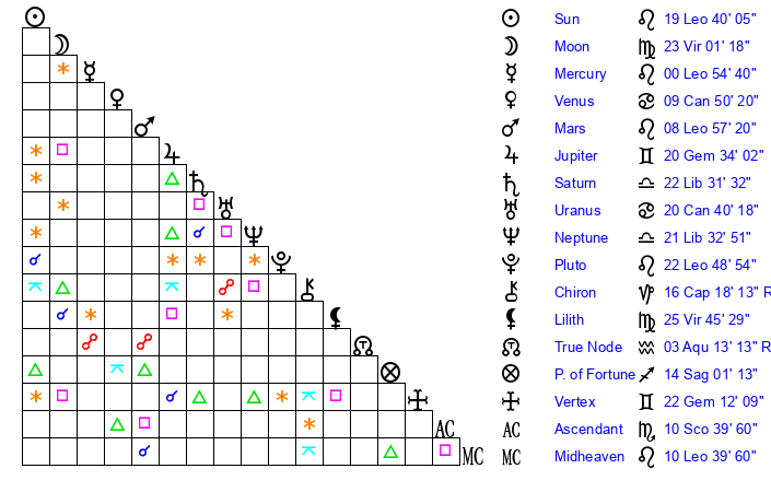 | Sun | 19 Leo 40 | 20 Leo 14 | 29 Libra 59 |