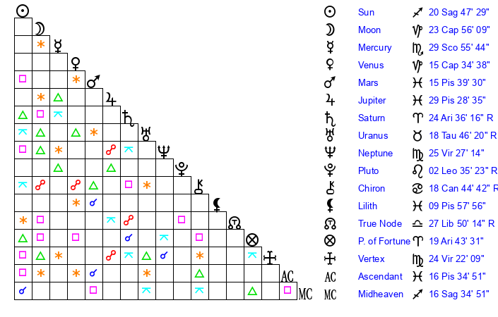 | Mercury | 29 Scorpio 56 | 2 Sagittarius 14 | 29 Pisces 47 |
