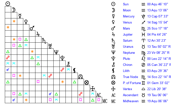 | Moon | 13 Aquarius 13 | 0 Scorpio 12 | 3 Aries 30 |