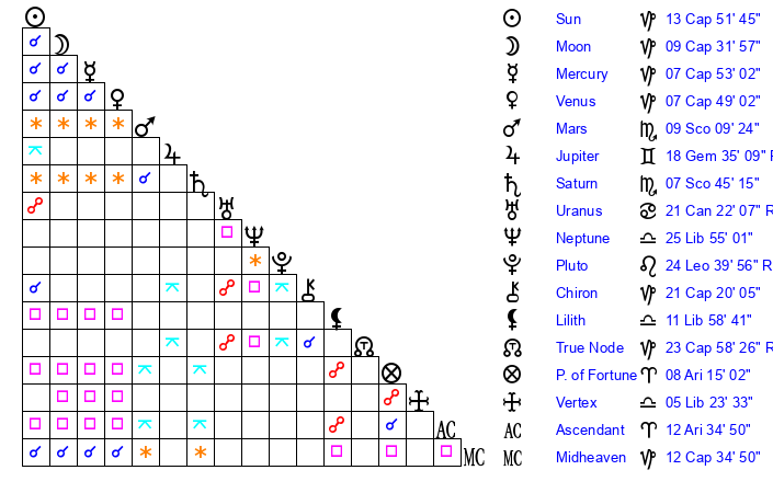 Sun | 13 Capricorn 51 | 14 Capricorn 38 | 25 Pisces 37 |