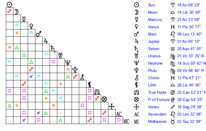 | Neptune | 14 Scorpio 58 | 0 Aries 20 | 13 Scorpio 24 |