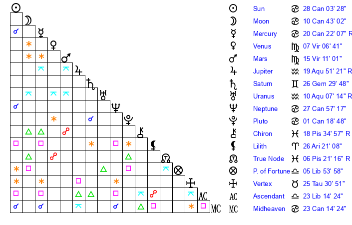 | Neptune | 27 Cancer 58 | 2 Aries 5 | 0 Leo 27 |