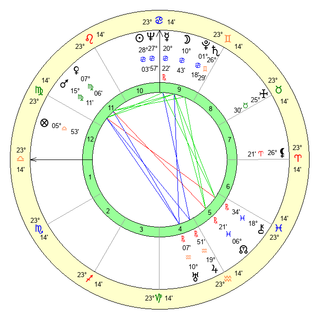| Moon | 10 Cancer 44 | 18 Gemini 17 | 1 Leo 13 |