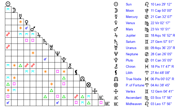 | Mercury | 21 Cancer 32 | 7 Leo 4 | 9 Scorpio 56 |