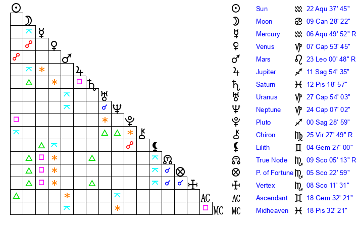Sun | 22 Aquarius 37 | 23 Aquarius 21 | 22 Pisces 46 |