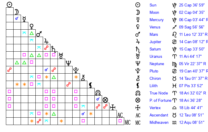 | Mercury | 6 Capricorn 3 | 12 Capricorn 9 | 13 Taurus 22 |