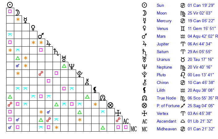 | Moon | 25 Virgo 6 | 8 Gemini 40 | 21 Scorpio 4 |
